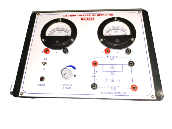 - Two resistances (100Ω) are connected in parallel and sockets fitted on junction to measure the voltage across the resistances in case of parallel circuit.